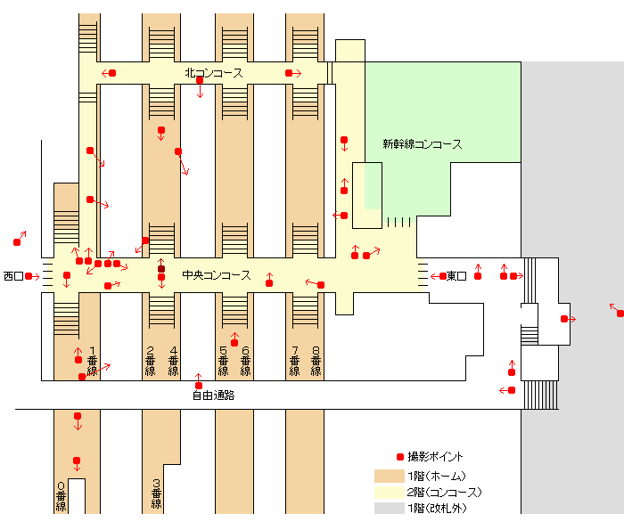 旧東口切符売り場、イーサイト、東口、旧東口1階への階段、東口中央部、自由通路東側、旧1番線ホーム、新自由通路旧1番線南側階段を更新。