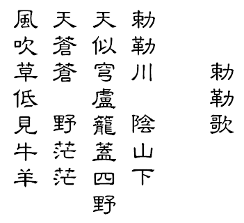 勅勒の川 陰山の下 (ちょくろくのかわ いんざんのもと) 天は穹廬に似て 四野を籠蓋す (てんはきゅうろににて しやをろうがいす) 天は蒼蒼 野は茫茫 (てんはそうそう のはぼうぼう) 風吹き草低れて 牛羊見る (かぜふきくさたれて ぎゅうようあらわる) |